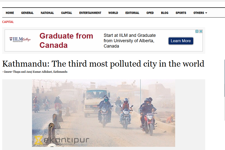 Few days back, there were headlines in national newspaper stating the Kathmandu Valley being third polluted city around the world which caught my eyes. Kathmandu Valley due to its geographical structure, continuous influx of population from all around the country, presence of more than 100 brick kiln industries, ever increasing number of vehicle and the emission caused by them, unplanned solid waste management strategies (no sanitary landfill site), limited drinking water supply as per demand, unplanned construction activities, etc. are the leading problem behind these pollution. But still, it was eye catching fact that Kathmandu Valley being third polluted city. The same surprise dragged me to check the research based site.